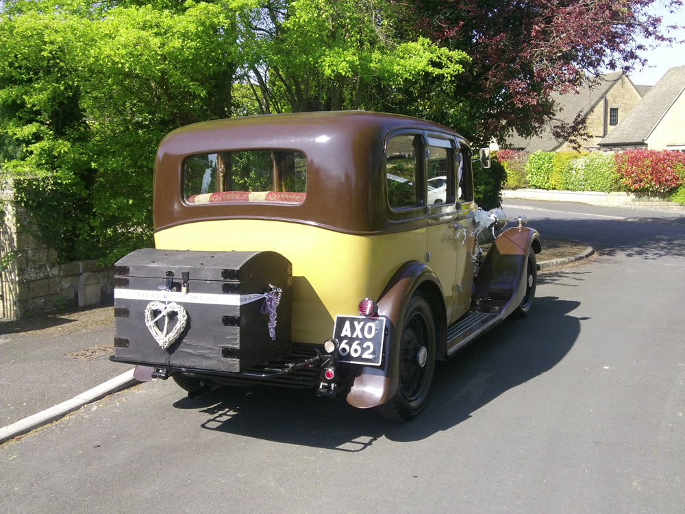 With just days to go I painted the car in high build primer, followed by a coat of synthetic coach enamel, applied with a B&Q mini roller, the bonnet top sections were the exception, I had removed these to my small workshop and had worked on them and the numerous lamps, brackets and so on, when the weather was not good enough to work outside. Time had caught up with me and with just two days left before the wedding, the bonnet top panels were still in bare aluminium, I gave them a light coat of etch, but simply did not have time to add a coat of high build primer. I bit the bullet and rolled on a generous coat of coach paint, it went on nicely and initially looked almost perfect, but unfortunately has since ‘sunk’ in places and will require more attention. The following morning I refitted the bonnet to the car, attached the lamps, handles, mirrors, running boards and various bits of trim, all of which had been cleaned and painted. The car looked lovely, and on the morning of the wedding, still smelling strongly of fresh paint (synthetic coach enamel has an aroma very much like Dulux Gloss), I carefully affixed the ribbons, horseshoes and rosettes that make a wedding day car look special.