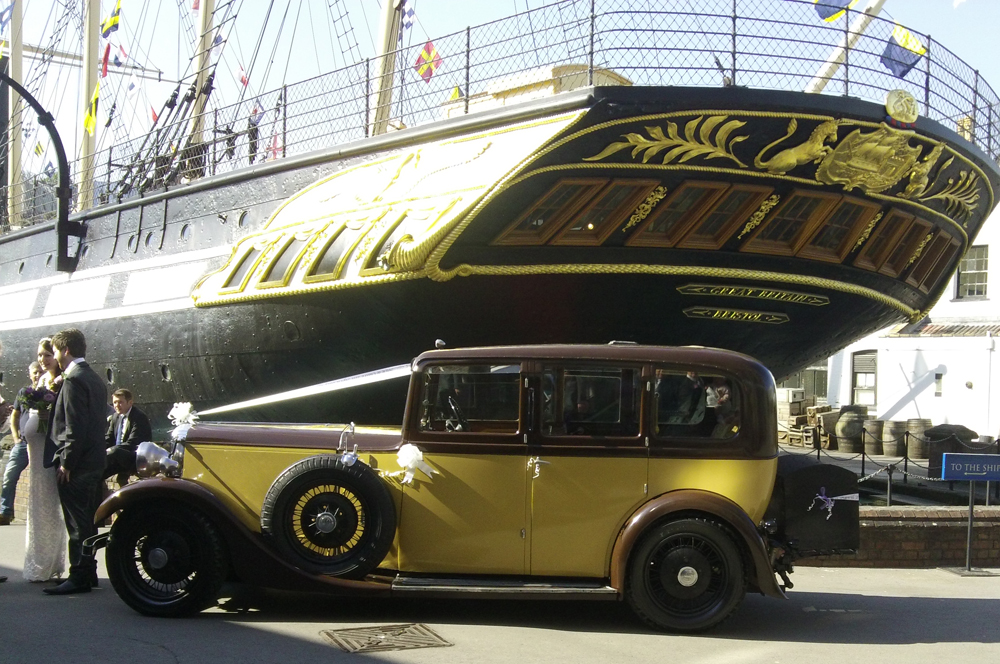 The ceremony took place in April in the late afternoon at the SS Great Britain, getting there involved a drive through rush hour traffic, stop start all of the way, and despite it being only half way though April, the weather was positively warm. My eyes barely left the temperature gauge, and like the ignition lamp, I was glowing – even with the front screen ajar. I need not have worried, the Daimler took the journey in its stride, received a compliment from the battle hardened doorman at the Marriott Hotel, where the bride and groom were staying, and a huge round of applause from a coach load of French tourists upon arrival at Brunel’s SS Great Britain. The official photographer seemed impressed with the Daimler and took many photographs, some even included the bride and groom!