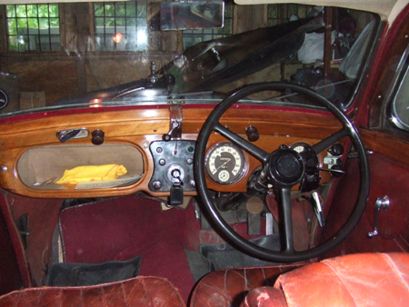 The unrestored woodwork was in good order and fitted with a typical Daimler switch panel. The opening windscreen provided more than adequate ventilation on a hot day. Unfortunately the sunroof had been sealed to prevent water leaks. When new, the steering wheel boss would have had a horn push and indicator switch fitted, the mechanism was missing, replacement switches can be seen on the right hand side of the dashboard.
